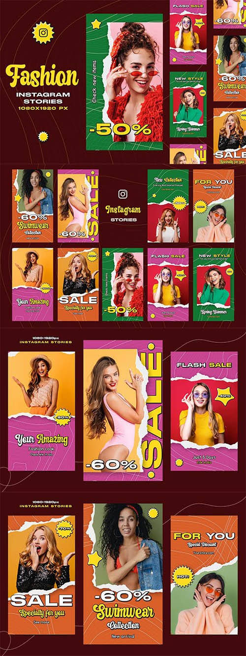 These Instagram story templates have a fun 90s style with bright colors and retro elements that can be edited with ease in Photoshop. The package includes 9 fully editable PSD templates with simple instructions and free font links. Note that model images and photographs are not included.